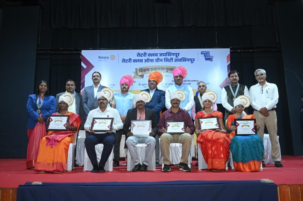 रोटरी क्लब जयसिंगपूर व रोटरी क्लब ऑफ ग्रीन सिटी जयसिंगपूर यांच्यावतीने तसेच सौ. रत्नाबाई मांगीलाल बजाज इंडस्ट्रियल पार्क यांच्या आर्थिक सहकार्याने जयसिंगपूर शहर व परिसरातील शिक्षण क्षेत्रात विशेष उल्लेखनीय सेवा बजावलेल्या शिक्षकांना शिक्षक उत्कृष्टता पुरस्कार 2025 देऊन सन्मानित करण्यात आले. सदर कार्यक्रम शनिवार दि. 27 सप्टेंबर 2025 रोजी दुपारी 4 वाजता सहकार महर्षी शामराव पाटील यड्रावकर नाट्यगृहात संपन्न झाला.