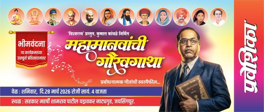 जयसिंगपूर येथे येत्या शनिवारी (दि. २८ मार्च) एक प्रेरणादायी सांस्कृतिक मेजवानी रंगणार असून ‘महामानवांची गौरवगाथा’ या संगीतमय प्रबोधनात्मक गीतांच्या कार्यक्रमाचे आयोजन करण्यात आले आहे.सहकारमहर्षी स्व.शामराव पाटील यड्रावकर नाट्यगृहात सायंकाळी ठीक ४ वाजता हा कार्यक्रम पार पडणार आहे.महाकारुणिक तथागत गौतम बुद्ध, भगवान महावीर,महात्मा बसवेश्वर, छत्रपती शिवाजी महाराज,महात्मा ज्योतिबा फुले,राजर्षी शाहू महाराज, डॉ. बाबासाहेब आंबेडकर तसेच आण्णाभाऊ साठे या महामानवांच्या संयुक्त जयंतीनिमित्त या विशेष कार्यक्रमाचे आयोजन करण्यात आले आहे.त्यांच्या विचारधारेवर आधारित गीतांच्या माध्यमातून समाजप्रबोधन करण्याचा या उपक्रमामागील उद्देश आहे.‘विश्वरत्न’ प्रस्तुत आणि कुणाल कांबळे निर्मित या कार्यक्रमात नामांकित गायक-कलाकारांचा सहभाग असणार आहे.यामध्ये गायक शुभम कांबळे, शीतल देसाई, विनायक कांबळे, शाहीर रफिक पटेल, विनायक लोखंडे, प्रदीपराज कांबळे तसेच गायिका काजल तोडकर हे आपल्या सुरेल आवाजातून उपस्थितांना प्रेरणादायी गीतांची मेजवानी देणार आहेत. कार्यक्रमाचे निवेदन स्वप्नील पन्हाळकर करणार असून वाद्यसंगतीसाठी संग्राम कांबळे, ऋतिक कुरणे, अमीर नदाफ, रमजान बालेखान, गणेश देसाई आणि पंचशील कांबळे यांची साथ लाभणार आहे.या कार्यक्रमाच्या माध्यमातून समाजातील सर्व घटकांपर्यंत समता, बंधुता आणि सामाजिक न्यायाचा संदेश पोहोचवण्याचा प्रयत्न आयोजकांनी केला आहे. विशेषतः युवकांमध्ये सामाजिक भान आणि प्रेरणा निर्माण व्हावी,यासाठी अशा प्रकारच्या प्रबोधनात्मक उपक्रमांची गरज असल्याचे मतही व्यक्त होत आहे.