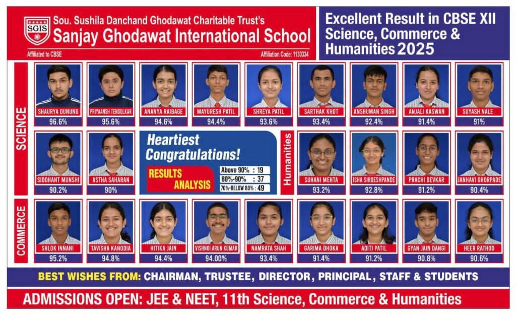 इयत्ता बारावी वाणिज्य शाखा प्रथम क्रमांक: श्लोक इनानी – 95.2%द्वितीय क्रमांक: तविषा अमितकुमार कनोडिया – 94.8% तृतीय क्रमांक: हितिका मनीषकुमार जैन – 94.4%इयत्ता बारावी मानव्यशास्त्र शाखा प्रथम क्रमांक: सुहानी चेतन मेहता – 93.2% द्वितीय क्रमांक: ईशा हृषीकेश सरदेशपांडे – 92.8%तृतीय क्रमांक: प्राची किरण देवकर – 91.2% निकाल विश्लेषण 90% पेक्षा जास्त – 19 विद्यार्थी 80% ते 90% – 37 विद्यार्थी 70% ते 80% – 49 विद्यार्थी 60% ते 70% – 43 विद्यार्थी 50% ते 60% – 20 विद्यार्थी 50% पेक्षा कमी – 4 विद्यार्थी ज्युनिअर कॉलेज विभागाचे प्राचार्य, श्री नितेश नाडे, सर्व शिक्षकवर्ग व पालकांनी या यशाबद्दल आनंद व्यक्त केला. चेअरमन श्री संजय घोडावत, विश्वस्त श्री विनायक भोसले, संचालिका सस्मिता मोहंती यांनी यशस्वी विद्यार्थ्यांचे व मार्गदर्शक शिक्षकांचे अभिनंदन केले.