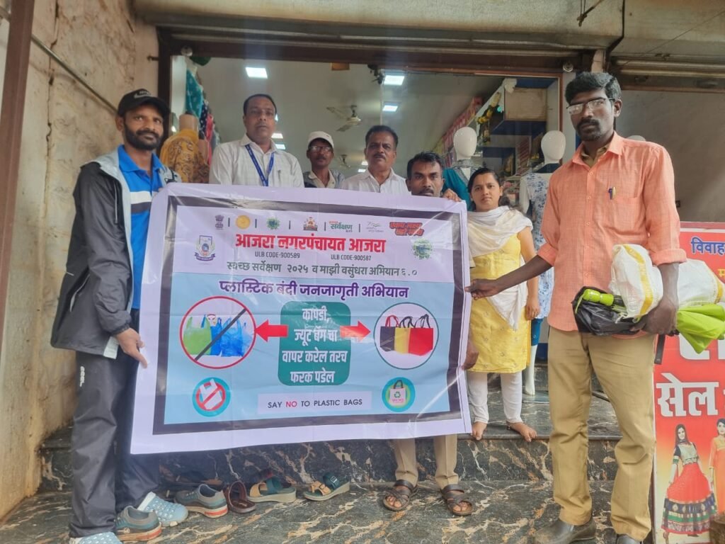 महाराष्ट्र राज्य शासनाच्या संकल्पनेतून महाराष्ट्रातील क्षेत्रीय कार्यालयासाठी 100 दिवसांचा कृती आराखडा राबविण्याचे निर्देश दिल्याप्रमाणे दि. 1 मे 2025 ते 15 ऑगस्ट 2025 या कालावधीत आजरा नगरपंचायत मार्फत “मुख्यमंत्री प्रशासकीय गतिमानता अभियान” या नावाने कृती कार्यक्रम राबविण्यात येत आहे. या अभियानामध्ये कचरा ठिकाणाचे सुशोभीकरण करणे, प्लास्टिक बंदी व त्याबाबत जनजागृती करणे, सफाई कर्मचाऱ्यांची आरोग्य तपासणी करणे,सी. सी. टी. व्ही कॅमेरे बसविणे, विरंगुळा केंद्राची स्थापना करणे इत्यादी कार्यक्रम राबविणेत येणार असून या अभियांनांतर्गत आज आजरा बाजारपेठेतून शहरामधील व्यावसायिक आस्थापनाची तपासणी करण्यात आली आणि प्लास्टिक बंदीबाबत जनजागृती करून प्लास्टिक वापरावर धडक कारवाई करीत प्लास्टिक पिशव्या जप्त करण्यात आल्या. या कारवाईत 3 किलो प्लास्टिक जप्त केले असून 5800/₹इतका दंडही वसूल करण्यात आला असल्याची माहिती स्वच्छता निरीक्षक अमर कांबळे यांनी दिली. आजरा नगरपंचायतीचे मुख्याधिकारी सूरज सुर्वे यांच्या मार्गदर्शनाखाली स्वच्छता निरीक्षक अमर कांबळे यांच्या नेतृत्वाखाली राबविण्यात आले. या अभियानामध्ये वरिष्ठ लिपिक संजय यादव, अरुण कांबळे, कोमल देसाई, अजिंक्य बागल, अनिकेत पाटील, रमेश कांबळे, जयवंत कांबळे, गणेश राम यांनी सहभाग नोंदवला.