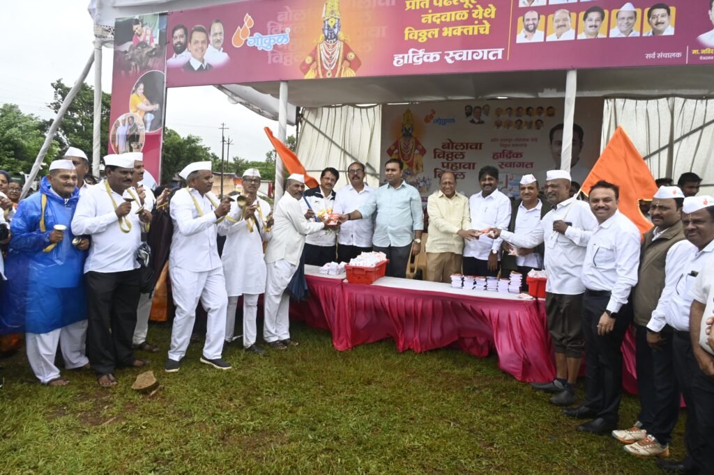 आषाढी एकादशीच्या निमित्ताने कोल्हापूरते प्रति पंढरपूर (नंदवाळ) ता.करवीर या मार्गावर दरवर्षीप्रमाणे काढण्यात आलेली पारंपरिक पायी दिंडी भक्तिभावाने पार पडली. हजारो वारकरी, टाळ-मृदंगाच्या गजरात सहभागी झाले असून, या भक्तिमय वातावरणात गोकुळ दूध संघाने वारकऱ्यांच्या सेवेसाठी मोफत सुगंधी दूधआणि हरीपाठ पुस्तिकांचे वाटप करून सामाजिक बांधिलकीची परंपरा जपली. या पायी दिंडीचे औचित्य साधून दिंडीतील भाविकांना गोकुळच्या वतीने ५ हजार सार्थ हरिपाठ पुस्तिका तसेच सुगंधी दूधाचे वाटप गोकुळचे चेअरमननविद मुश्रीफ यांच्या हस्ते करण्यात आले. नंदवाळ दिंडीत दरवर्षी हजारो वारकरी सहभाग घेतात. गोकुळतर्फे आम्ही त्यांच्यासाठीदिलेले दूध आणि हरीपाठ हे केवळ सेवा नव्हे, तर आमचं भक्तीभावातून केलेलं योगदान आहे.शेतकरी हे गोकुळचे आधारस्तंभ आहेत. त्यांचं हित आणि समाजाची सेवा हेच गोकुळचं खऱ्या अर्थाने काम आहे. असे या प्रसंगी मनोगत व्यक्त करताना चेअरमन नविद मुश्रीफ म्हणाले, यावेळी संघाचे माजी चेअरमन व ज्येष्ठ संचालक विश्वासपाटील, अरुण डोंगळे, संचालक बाबासाहेब चौगले, अजित नरके, संभाजी पाटील, प्रकाश पाटील,बयाजीशेळके, संचालिका शौमिका महाडिक, कार्यकारी संचालक डॉ.योगेश गोडबोले, मार्केटिंग व्यवस्थापक हनमंत पाटील, उपेंद्र चव्हाण, जनसंपर्क अधिकारी सचिन पाटील, लक्ष्मण धनवडे, उल्हासपाटील, महिला नेतृत्व अधिकारी मृण्मयी सातवेकर, संपदा थोरात, संघाचे अधिकारी कर्मचारीव महिला स्वयंसेविका आदि उपस्थित होते.